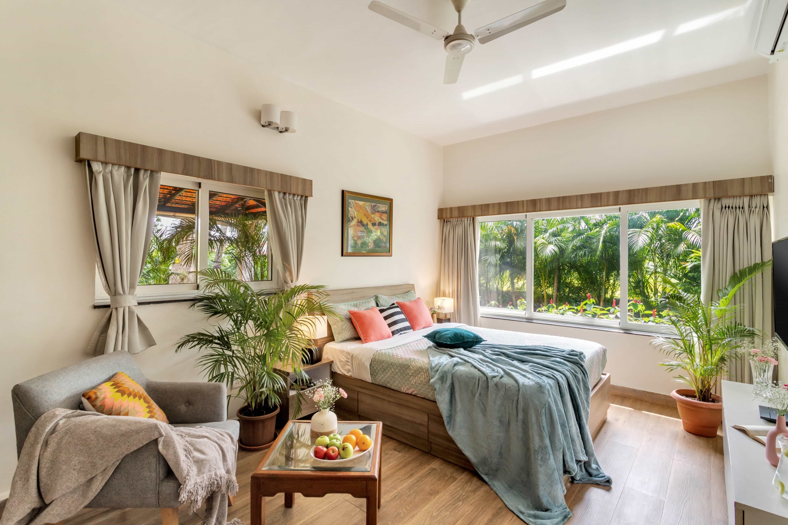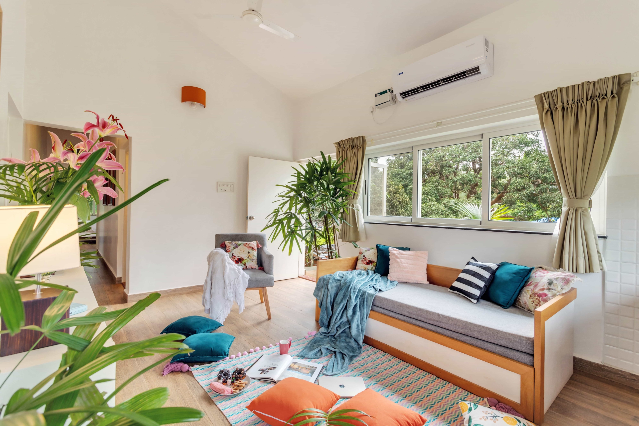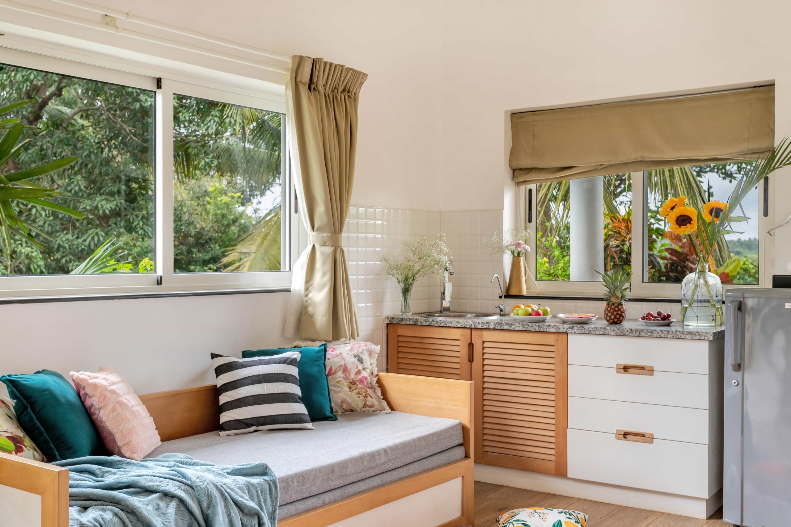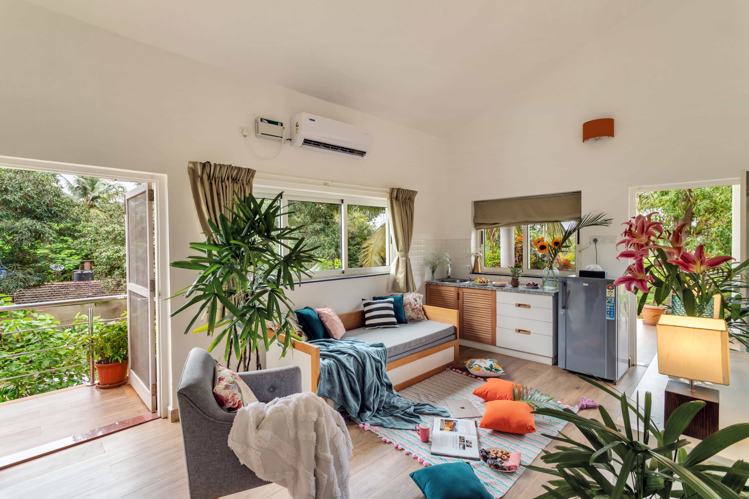 The living and dining areas are designed for gatherings and quality time with family and friends. Whip up your favorite meals in the fully-equipped kitchen or opt for a personal chef to prepare delectable Goan cuisine right in the comfort of your villa.